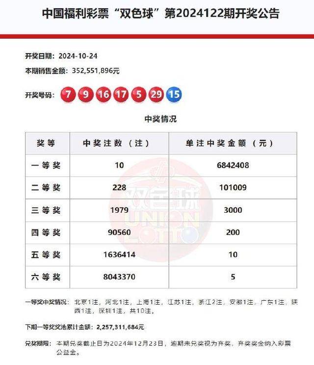 22:08本期一等奖共开出10注,单注奖金684万元,10注头奖分落9地。其中浙江中出2注,北京、河北、上海、江苏、安徽、广东、陕西和深圳各中得1注。二等奖开出228注,单注奖金10.1万余元。本期双色球全国销量为3.52亿元,计奖结束后奖池余额为22.57亿元。