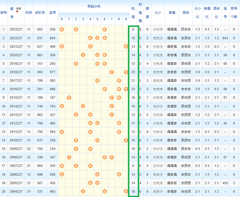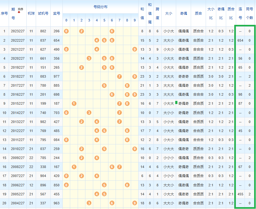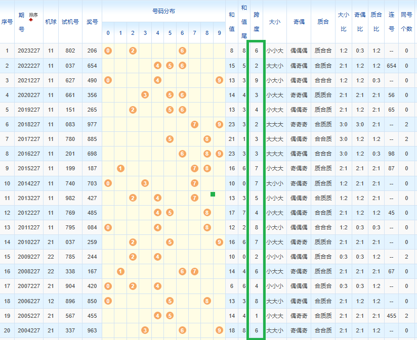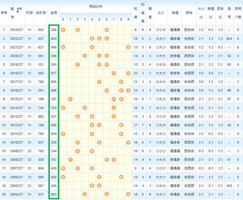 1、经统计0号出现6次、1号出现2次、2号出现6次、3号出现3次、4号出现8次、5号出现9次、6号出现7次、7号出5次、8号出现6次、9号出现4次.统计后出现次数靠前的数字作为我们的备选号码.其号码有540268