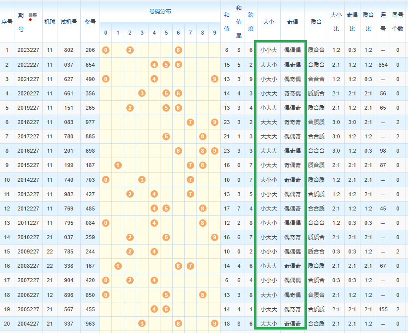 这20期大小组合:出2大一小最多,本期可以考虑大大小、大小大、小大大,奇偶组合:当出全偶后出2奇1偶多,本期不防考虑一下奇奇偶。